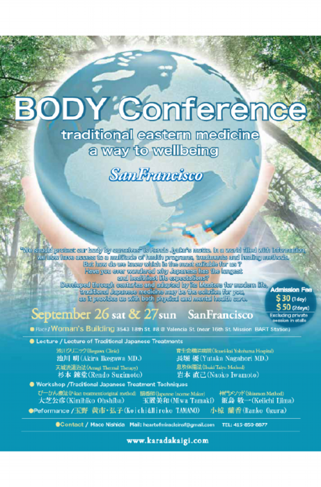 2010年から天城流湯治法セミナーを開催しているサンフランシスコで、やっとからだ会議を開催出 来ることをとてもうれしく思います。今、世界あちこちで開催されているからだ会議。